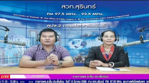 วันพุธที่ 12 มีนาคม 2568 เวลา 11.00 – 12.00 น.ณ สถานีวิทยุกระจายเสียงแห่งประเทศไทย จังหวัดสุรินทร์ FM97.50 MHz.